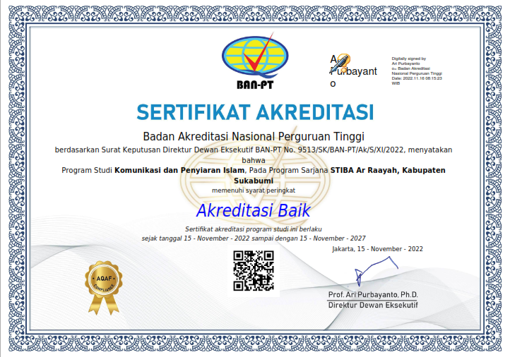 Program Studi Komunikasi dan Penyiaran Islam (KPI) Institut Muslim Cendekia yang sebelumnya dikenal STIBA Ar Raayah Sukabumi. Pada tahun 2025 sesuai keputusan KMA Nomor 333 Tahun 2025 tentang izin perubahan bentuk dari STIBA Ar Rayah Menjadi Institut Muslim Cendekia. Program Studi Komunikasi dan Penyiaran Islam sebelumnya berizin operasional pada tanggal 9 November 2012 dengan SK 2345 tahun 2012. Namun mulai mengoperasikan Program Studi Komunikasi dan Penyiaran Islam pada tahun 2018. Akreditasi Program Studi KPI Institut Muslim Cendekia adalah BAIK sesuai Direktur Dewan Eksekutif BAN-PT Nomor 9513/SK/BAN-PT/Ak/XI/2022